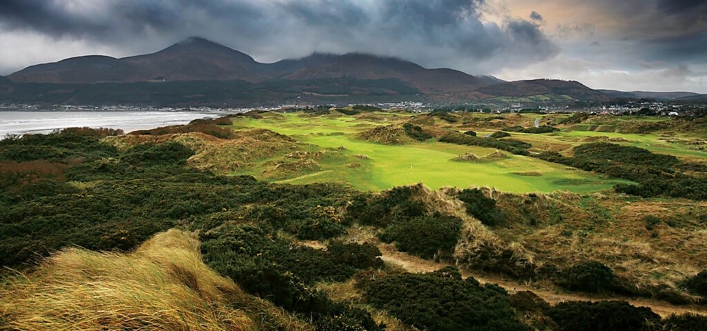 Royal County Down is the world’s highest rated golf course according to Golf Digest on their 2016 rankings. It is framed in one of the most stunningly natural links settings. The Murlough Nature Reserve provides the stage, the magnificent Mourne mountains the backdrop. The narrowest ribbons of fairways thread their way through as impressive a set of sand dunes as could be imagined. The fairways are surrounded by purple heather and golden gorse, so beautiful to look at, but so punishing for any who may stray from the prescribed path. The ‘bearded’ bunkers are world famous, featuring overhanging lips of marram, red fescue and heather. The greens are fast and many are domed, rejecting any shot lacking conviction.